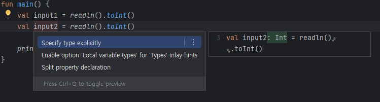 ※ IntelliJ에서는 타입을 명시하거나 명시된 타입을 제거하는 단축키가 있음, 캐럿을 변수 식별자에 두고 "Alt + Enter"를 클릭하면 아래와 같이 타입을 자동으로 생성 및 제거 가능